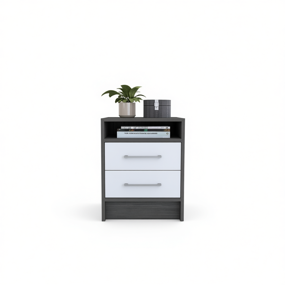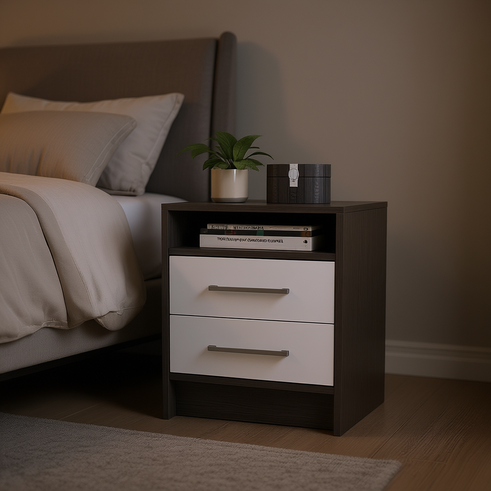 Comodino Philadelphia a Due Cassetti con Ripiano Nascosto, Arredamento Moderno in Legno per Camera da Letto