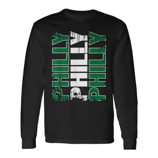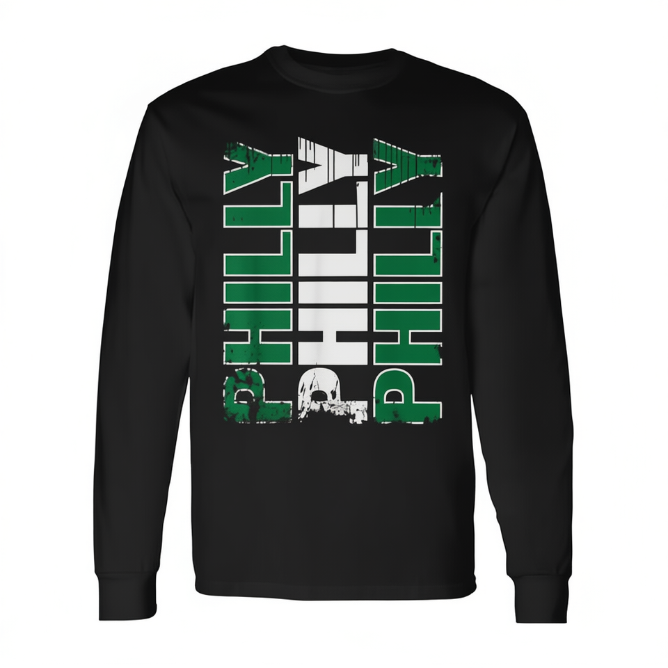 T-shirt a maniche lunghe con stampa serigrafica Philly, verde e bianco, design grafico, City Pride, unisex, per adulti