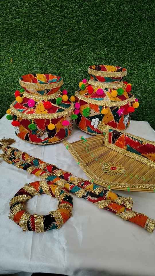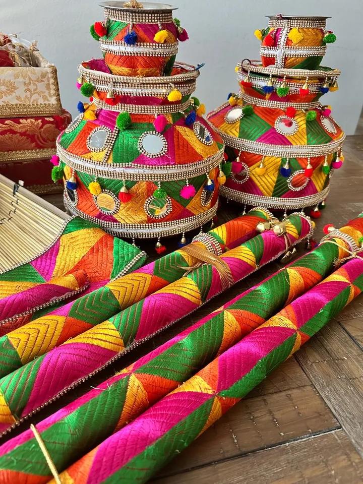 Phulkari Jaggo Set completo di elementi essenziali per la notte di Jaago con Danda, Jaggo, Chaj e bastoncini per matrimoni Sangeet, Pakistani e Sikh