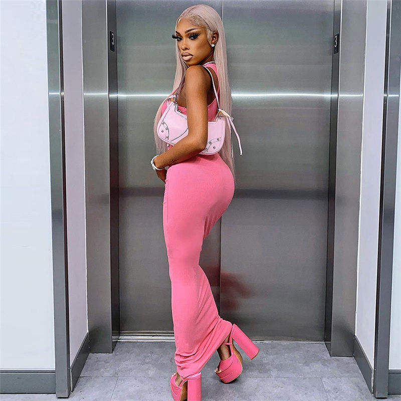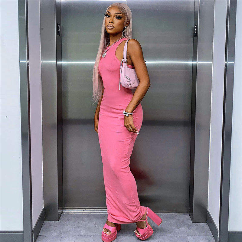 Pink Bodycon Top Casual Long Dress Breathable Elegant Features Office Lady Sleeveless O-Neck Knitted Tight Waist Day