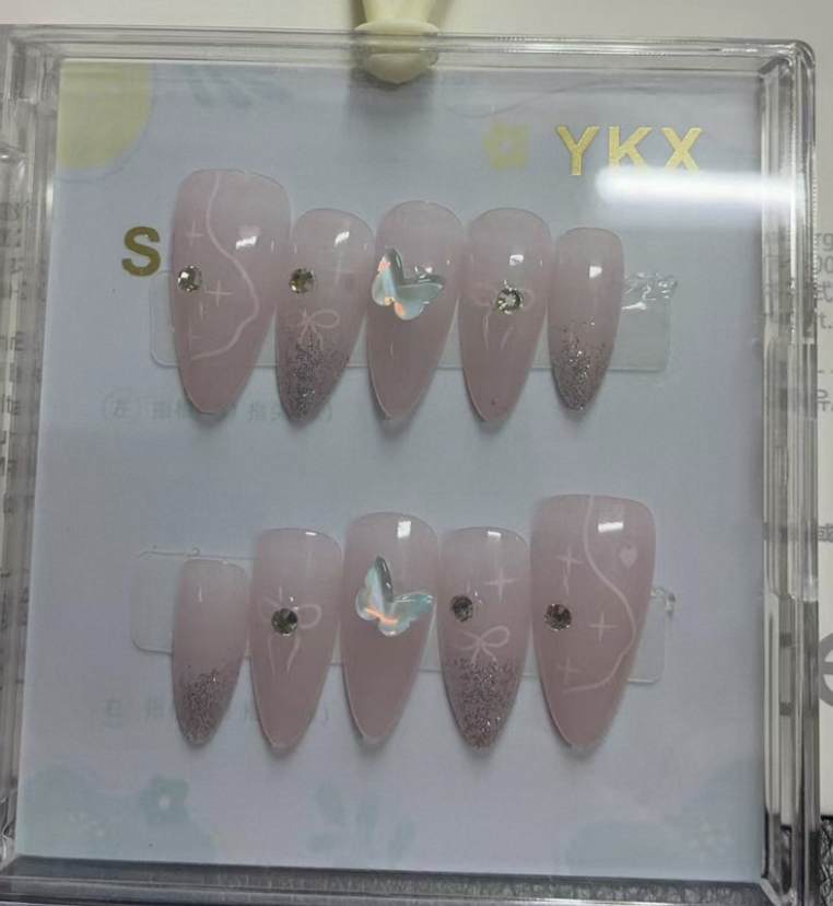 Unghie finte rosa a forma di farfalla, lunghezza media, con strass acrilici, 10 pezzi per nail art.