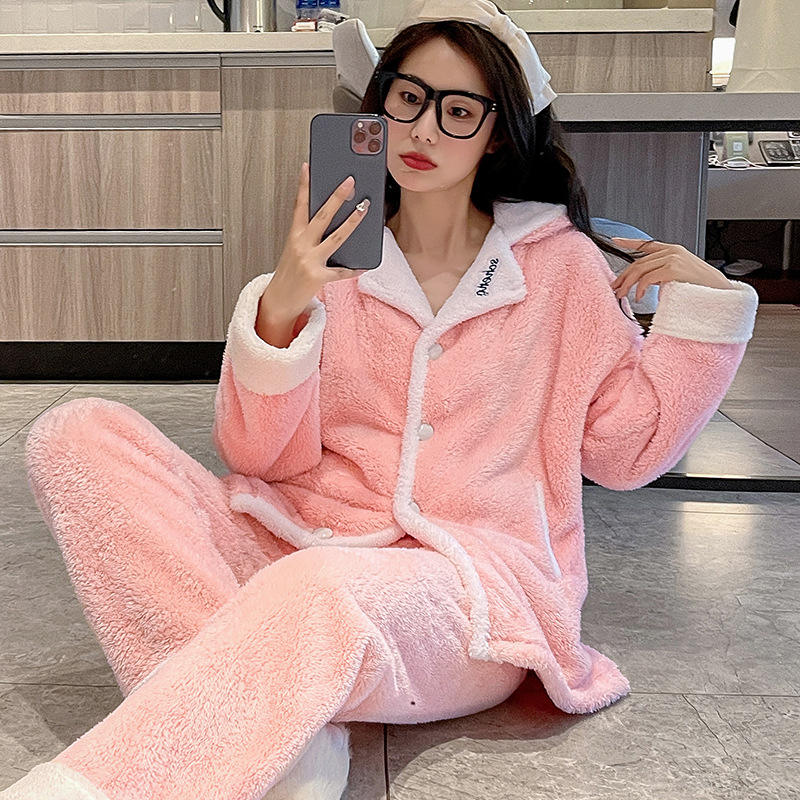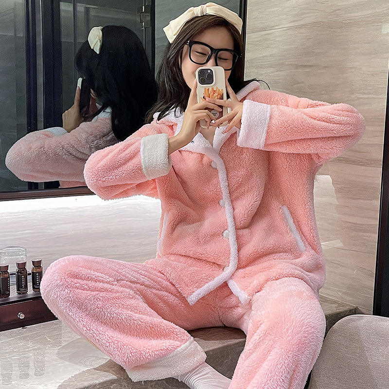 Set di pigiami in pile con bottone rosa per donna a maniche lunghe in pile di corallo e pigiama da donna in pile di spessore invernale