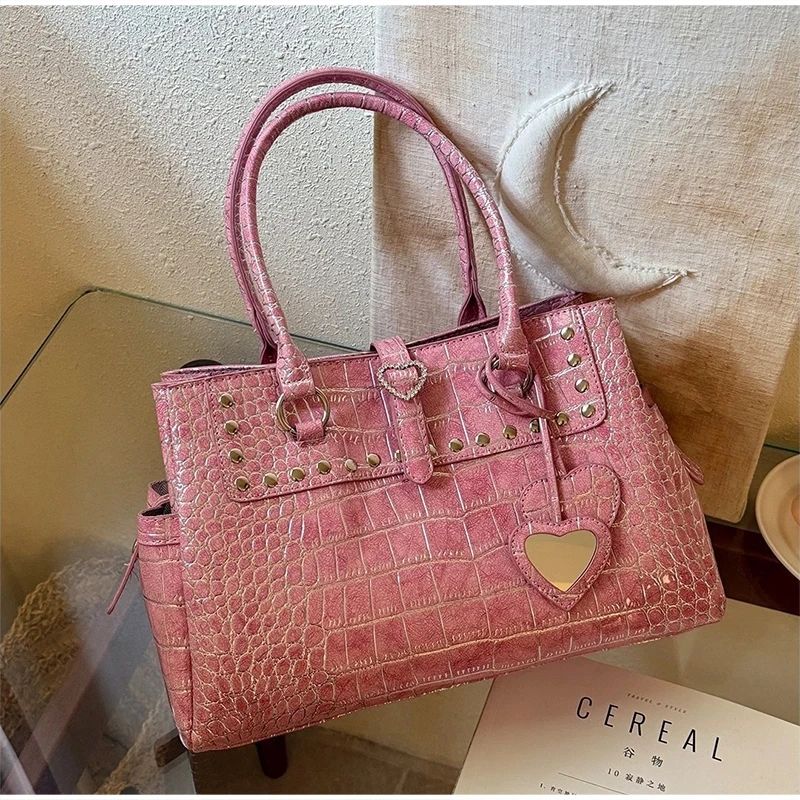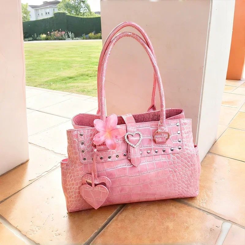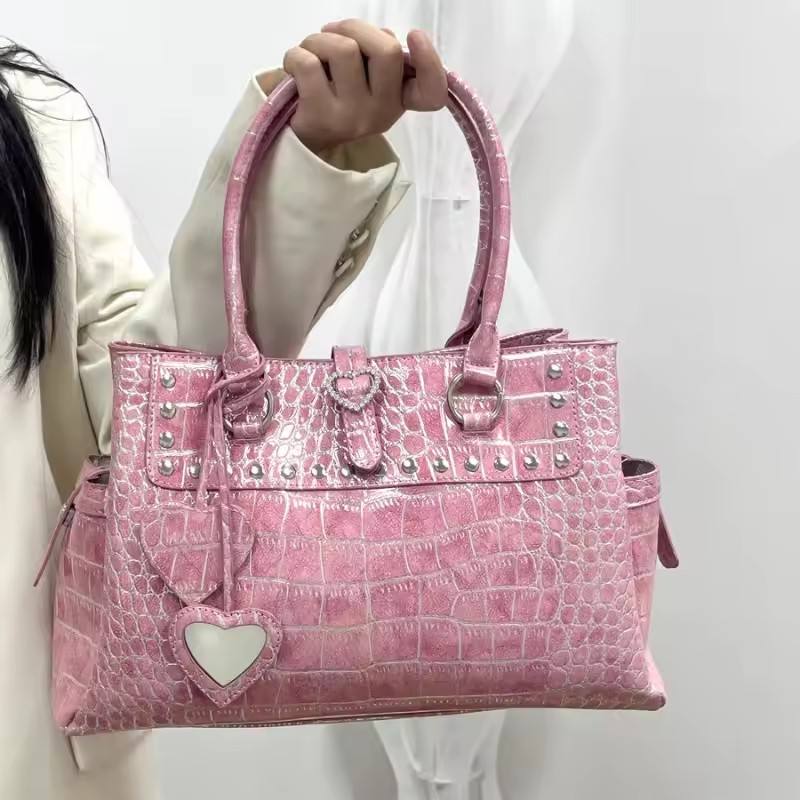 Borsa Tote Rosa con Motivo Coccodrillo Stile Y2K, Design Love, Borsa a Tracolla da Donna con Rivetti e Tasca Laterale, Borsa a Spalla di Marca per il Pendolarismo