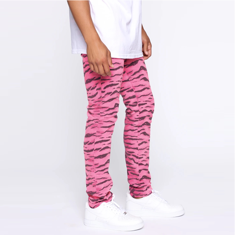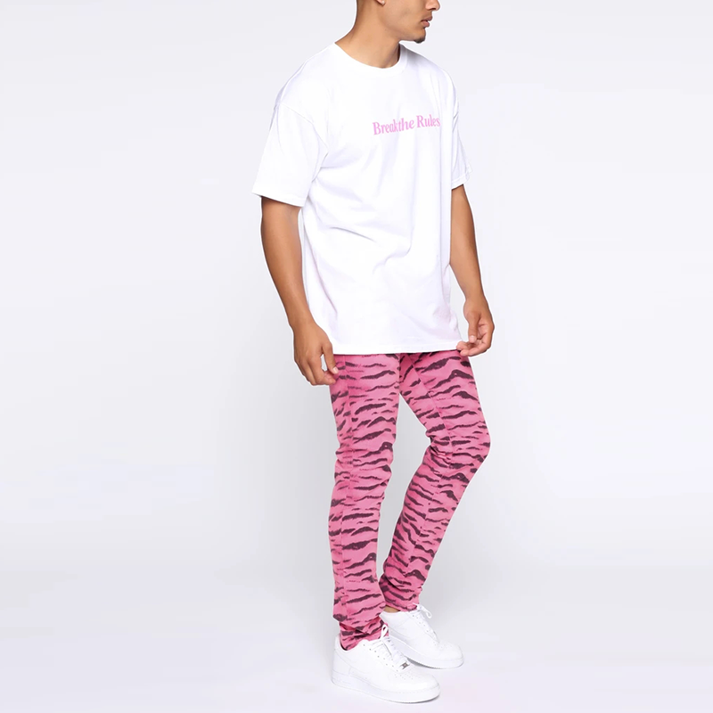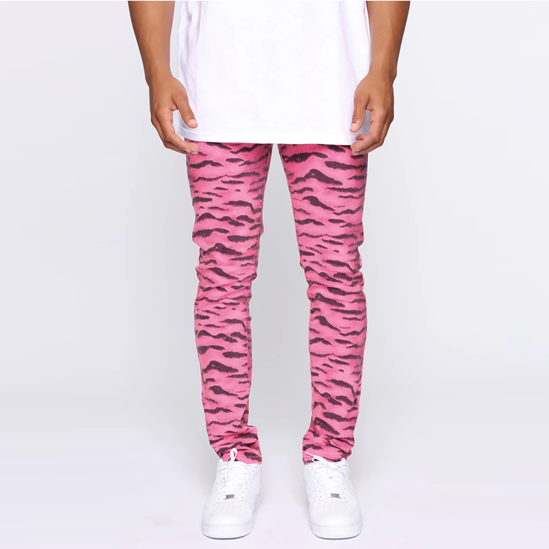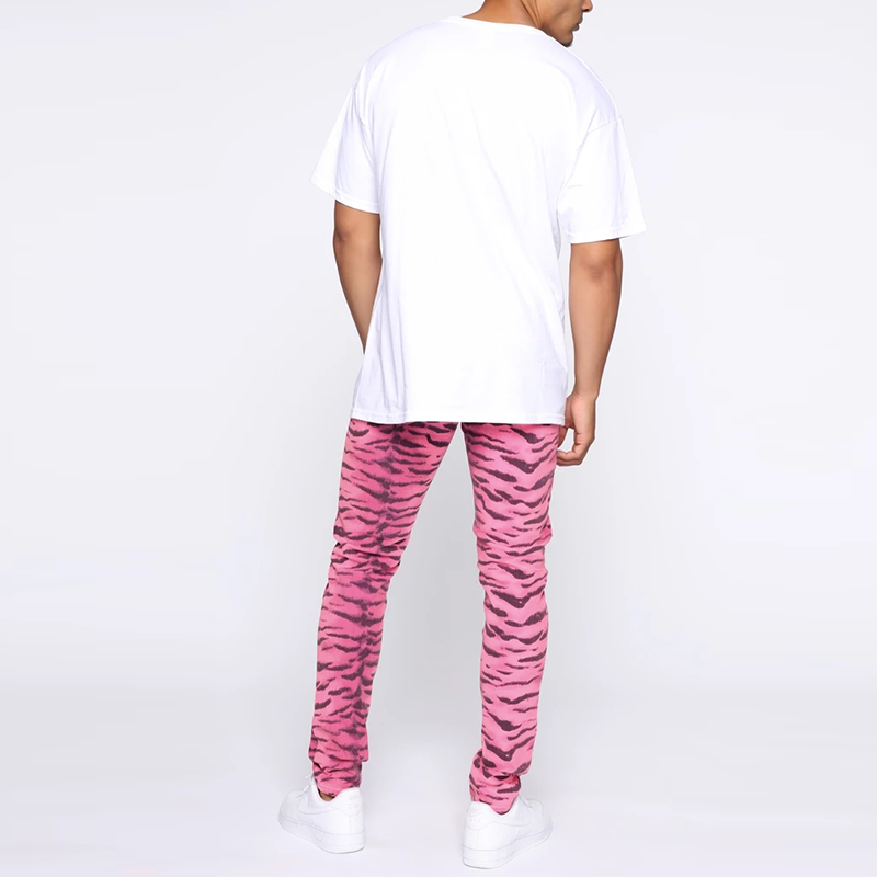 Jeans Skinny Elasticizzati da Uomo con Stampa Animalier a Strisce di Tigre in Denim Rosa