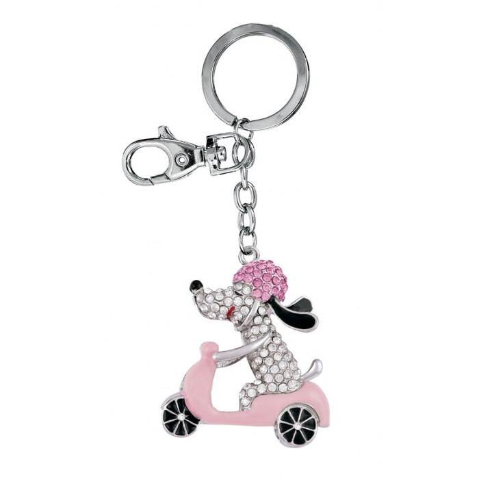 Portachiavi con Cane Rosa su Scooter con Strass e Chiusura in Metallo