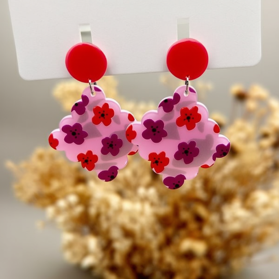 Orecchini Pendenti Floreali Rosa Angelina con Borchie Rosse in Resina Acrilica, Gioielli da Festa per Donne