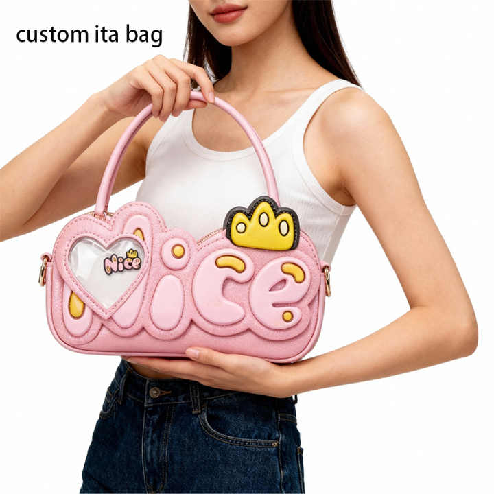 Borsa a tracolla in pelle PU rosa con lettere 'NICE' e decorazione a corona, con finestra per spilla a cuore, per un look dolce e alla moda