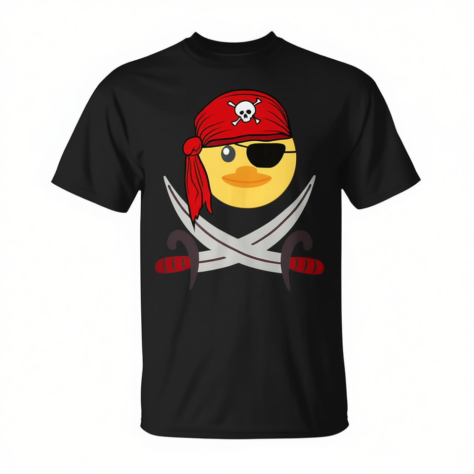 T-shirt con papera pirata, benda sullo occhio e spade, design divertente e originale, nero