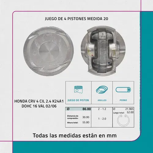 Set Pistoni 20 Honda CRV 4 Cilindri 2.4 K24A1 DOHC 16V 02/06