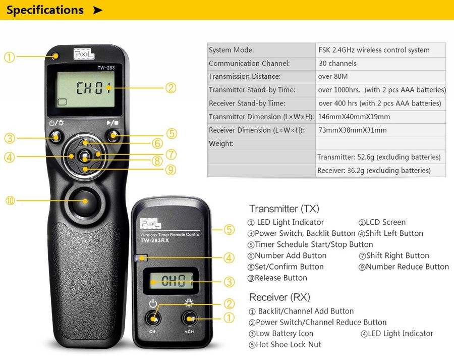 Pixel TW-283 Telecomando Wireless con Timer per Fotocamera