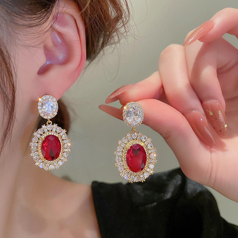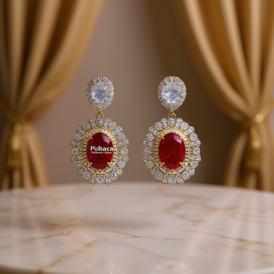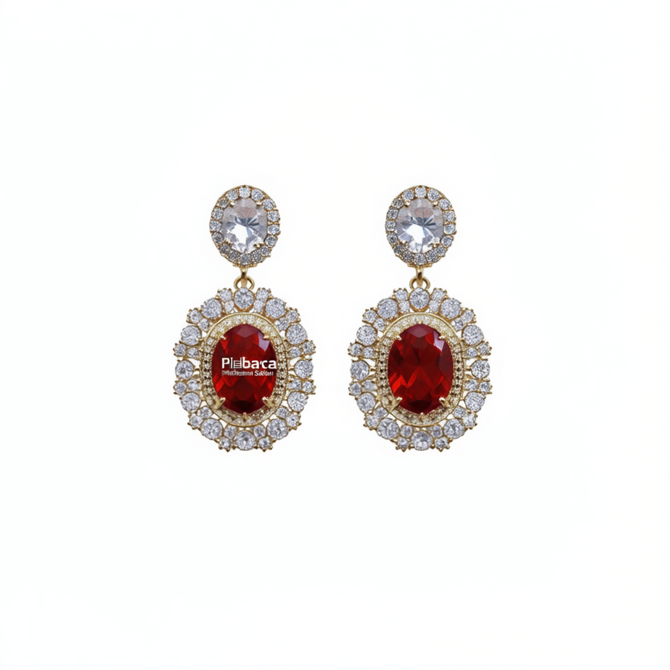 Orecchini pendenti Plbaca placcati in oro con zirconi rossi e strass in cristallo con montatura a castone per donna, stile classico da festa