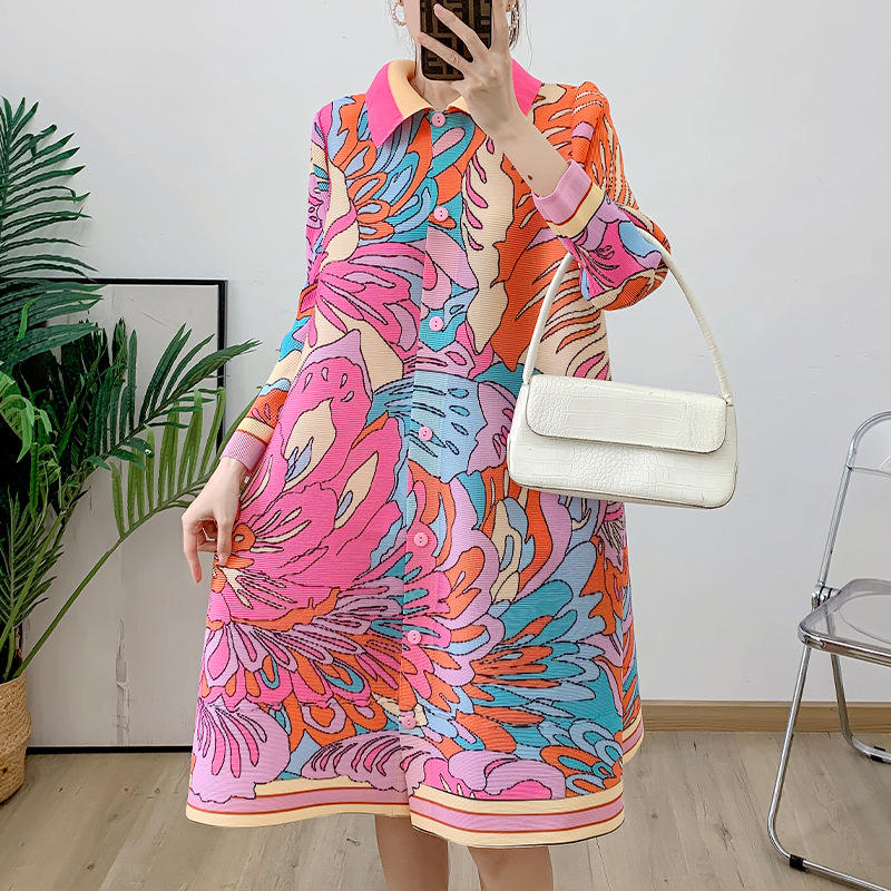 Pleated 2024 New Summer Large Size Stand Collar Pink Shirt Dress Fashion Casual Miyake Women Pleated Dress