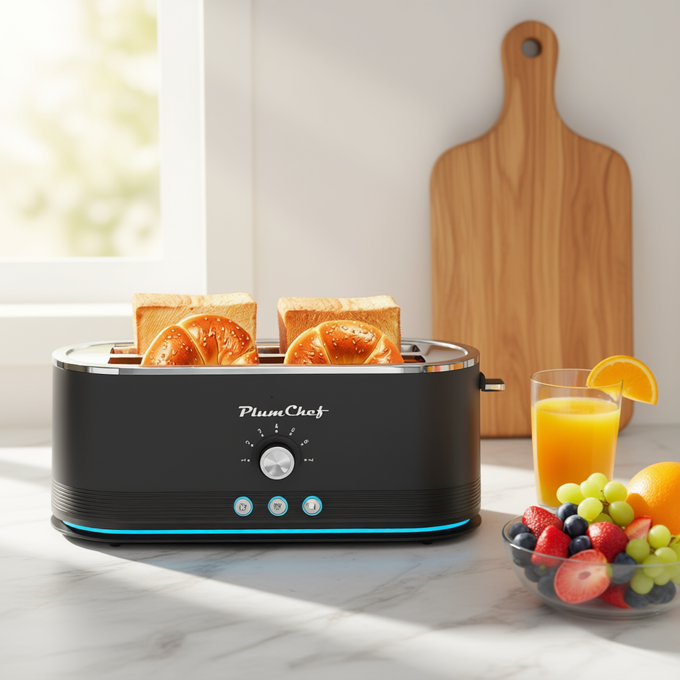 Tostapane PlumChef a 4 Fette 1350W in Acciaio Inox con 7 Livelli di Tostatura e Funzione Scongelamento e Riscaldamento