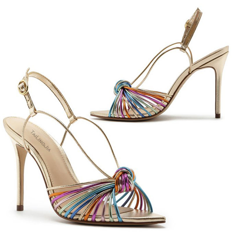 Plus Size Elegant Rainbow Knot Women Shoes Pointed Toe Ankle Strap Stiletto Ladies High Heel Dress Sandals