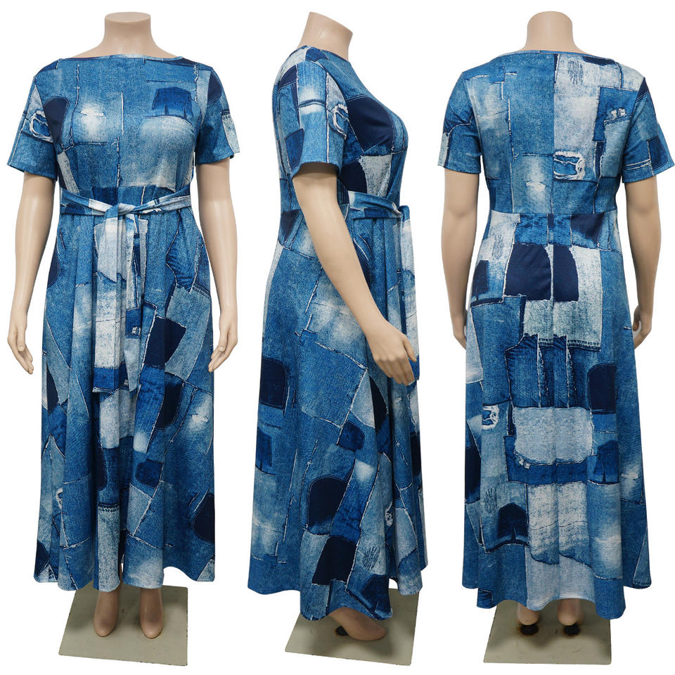 Vestito Casual da Donna Taglie Forti, Nuovo Arrivo, Stampa Digitale, Geometrico, Abbinamento Colori, Manica Corta, Collo Tondo, Linea ad A, con Cintura