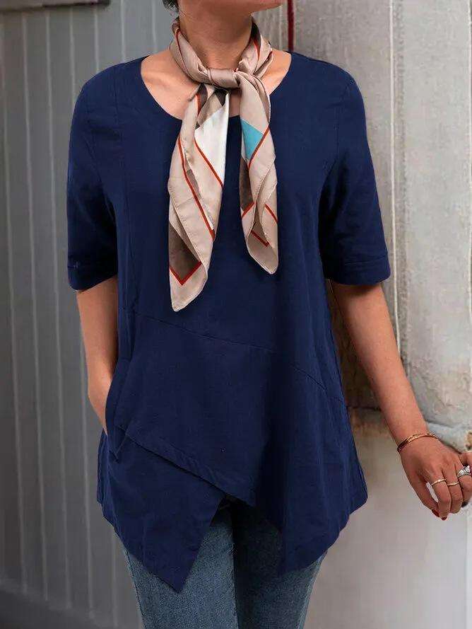 Plus Size New Women's Vintage Pocket Blouses Irregular O-neck Cotton Linen Middle Sleeve T -shirt