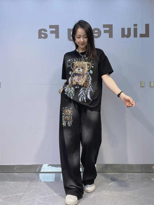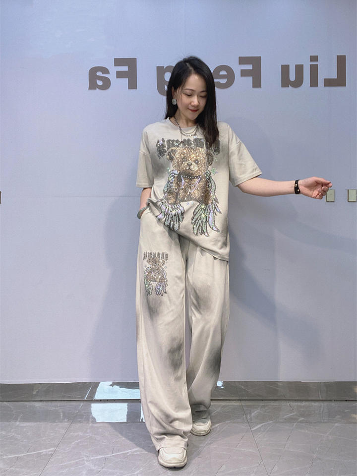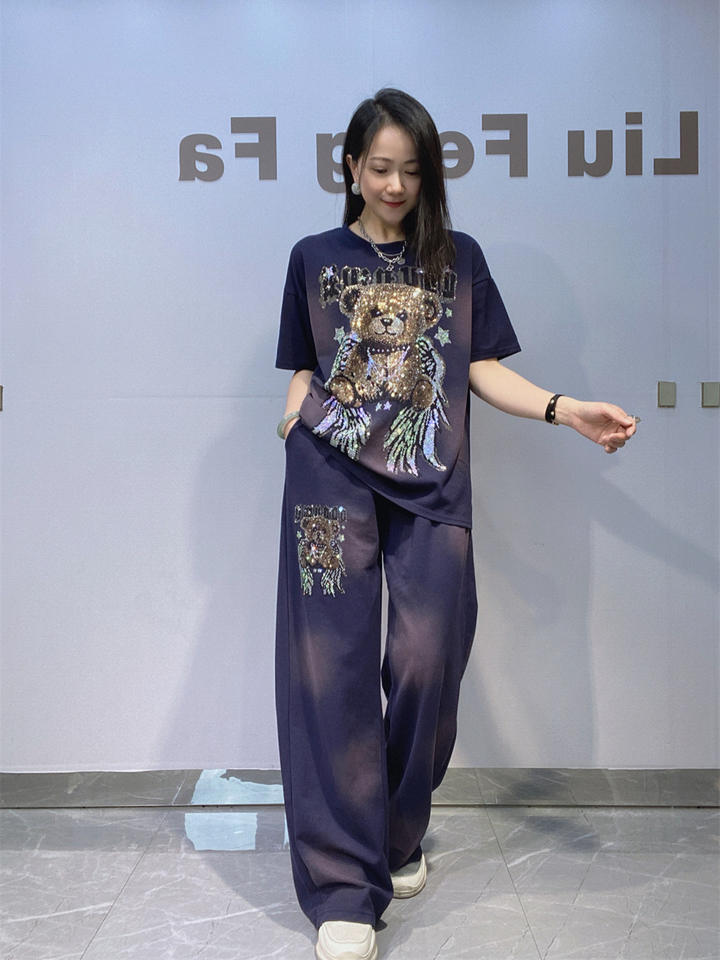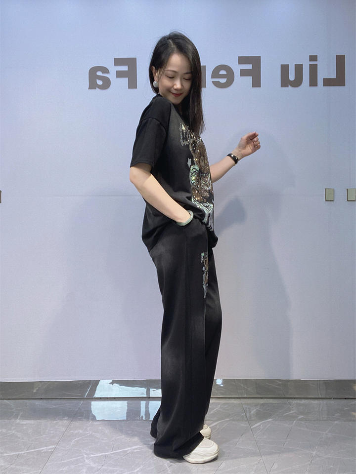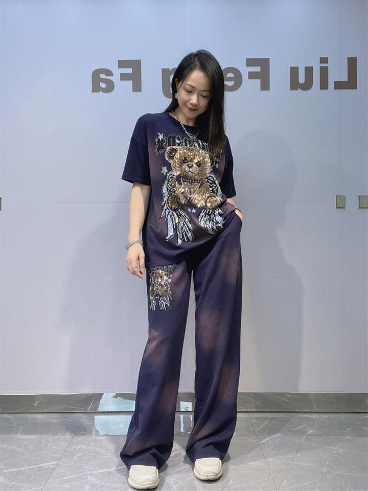 Completo Estivo da Donna Taglie Forti con Pantaloni Dritti e Top a Maniche Corte Tie-Dye con Strass, in Cotone Spandex, Stile Casual Europeo Americano