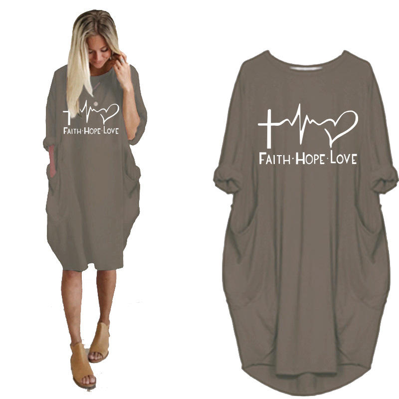 Abito Taglie Forti Autunnale a Maniche Lunghe con Stampa 'Faith Hope Love', Camicia da Donna Vestibilità Ampia alla Moda con Tasche