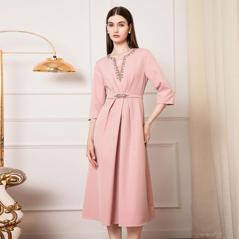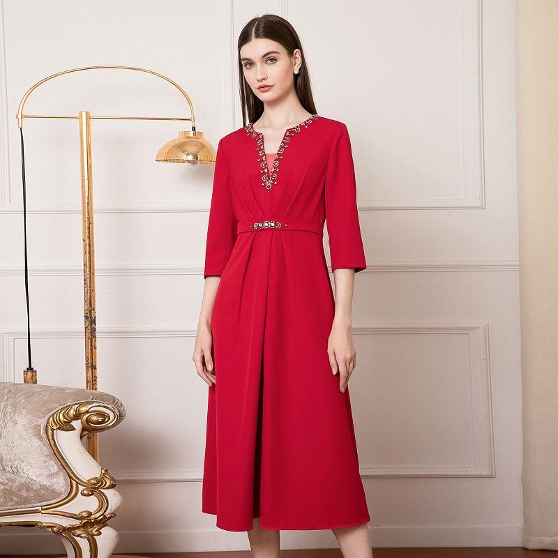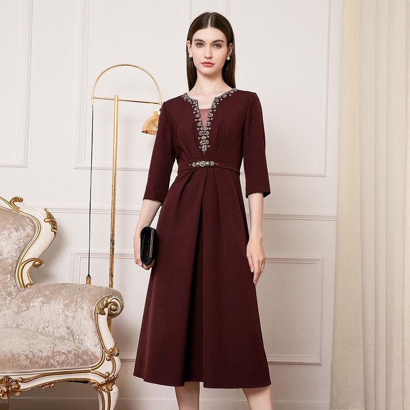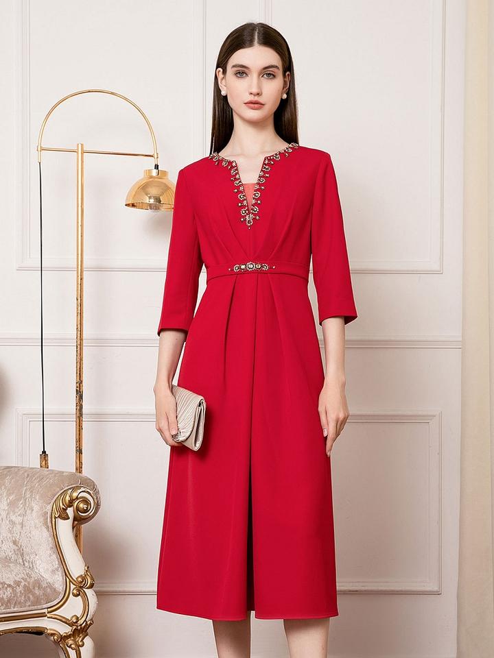 Taglie forti abito da donna 2025 primavera sposa madre elegante scollo a V con perline a manica 3/4 abito da caffè rosso Midi Cocktail Party