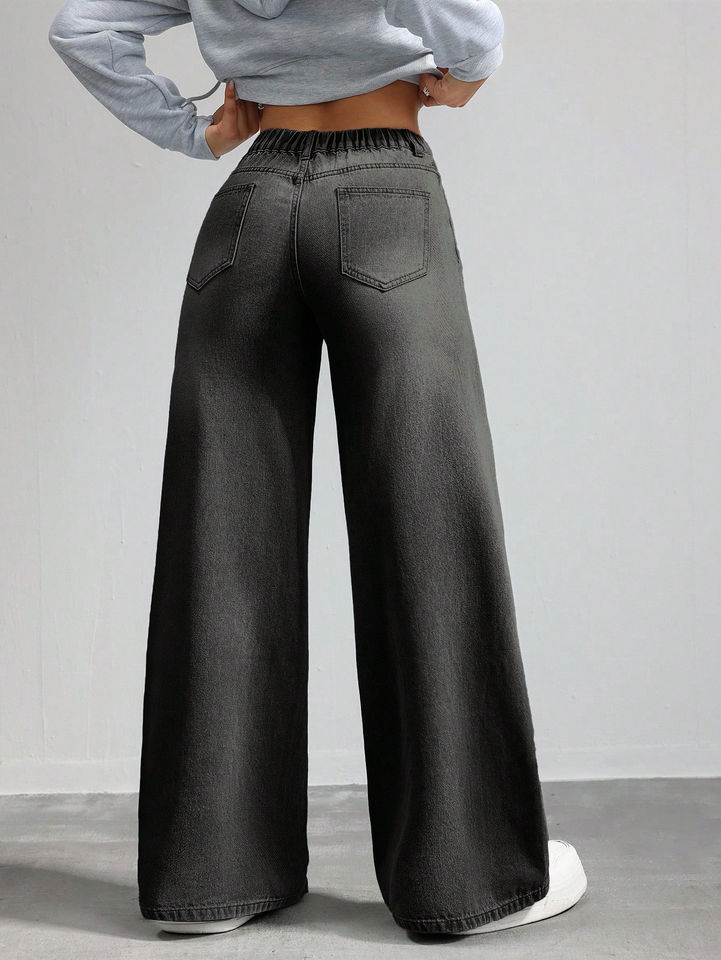 Jeans a Gamba Larga per Donna Taglie Forti, Vita Alta Elasticizzata, Traspirante, Alta Elasticità, Tinta Unita Scura, Pantaloni Larghi