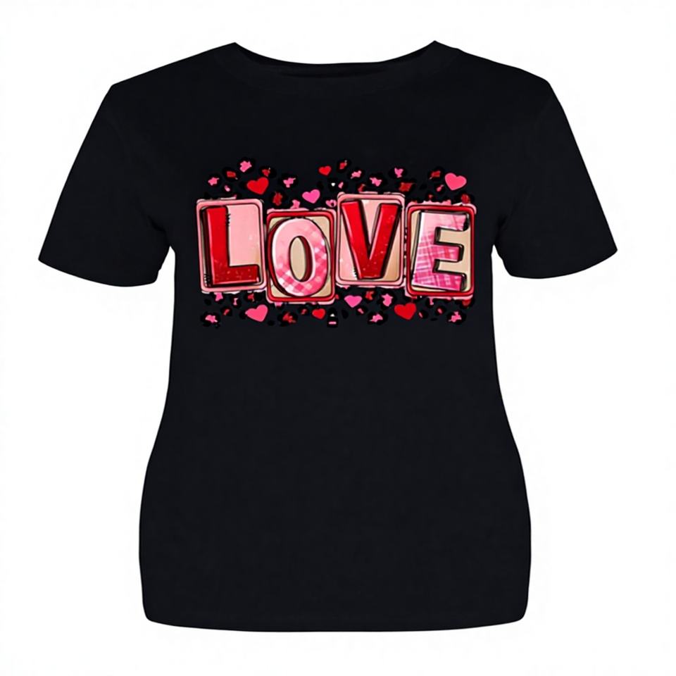 T-shirt da donna taglie forti a maniche corte con stampa di cuori leopardati e scritta 'Love Letters' per San Valentino, in tessuto lavorato a maglia casual per tutte le stagioni