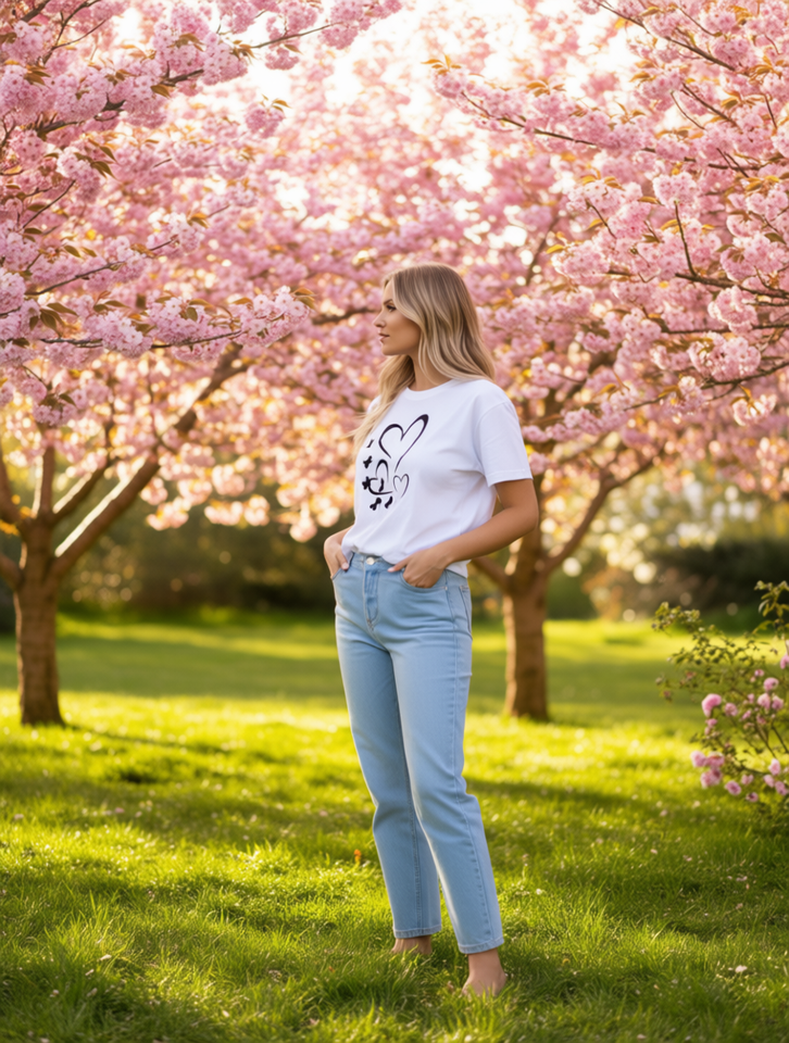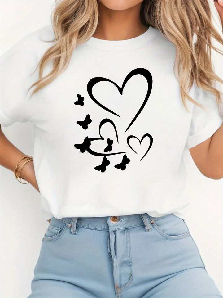 Plus Size Women's T-Shirt Hearts Butterflies Print Short Sleeve Round Neck Casual Loose Fit Spring Summer Top Machine Washable
