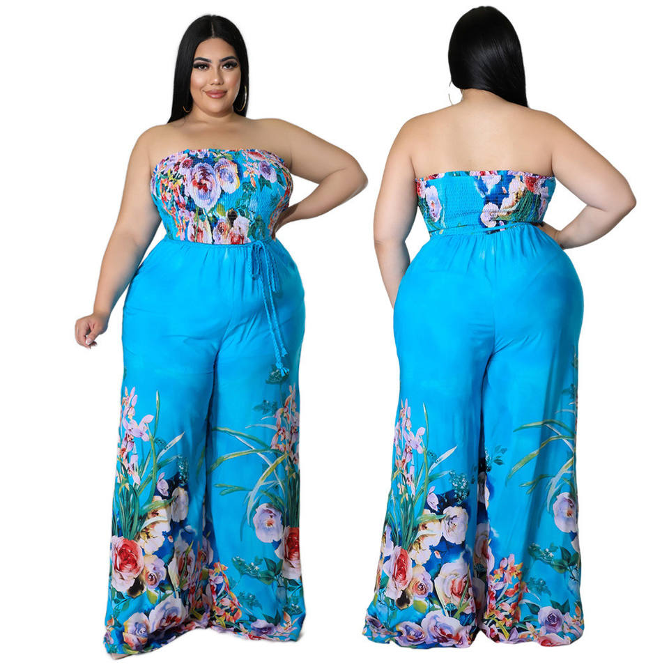Plus size women's floral printed wide leg jumpsuit