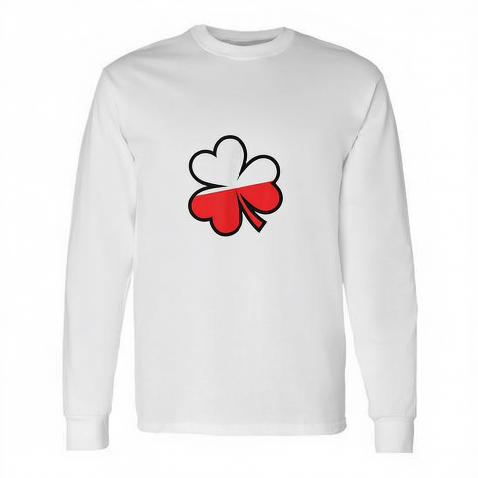 Maglietta a maniche lunghe per il giorno di San Patrizio, design con trifoglio rosso e bianco