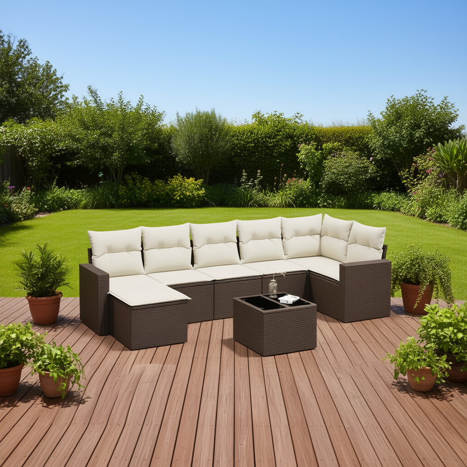 Set di divani da giardino in polyrattan, 8 pezzi, mobili da esterno marroni con cuscini, stile contemporaneo
