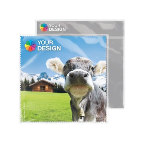 Panno per la pulizia degli occhiali POLYCLEAN 18x18 cm in sacchetto di polietilene con scheda inserita personalizzata