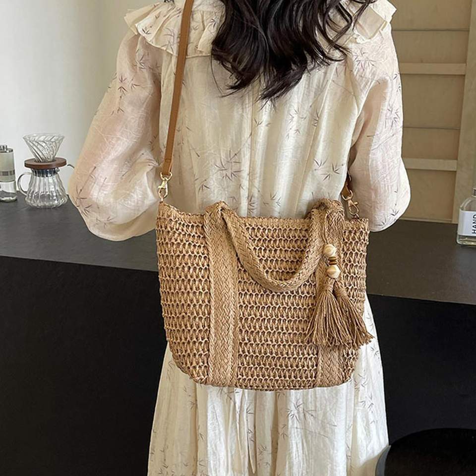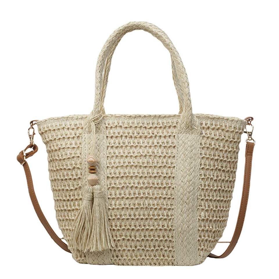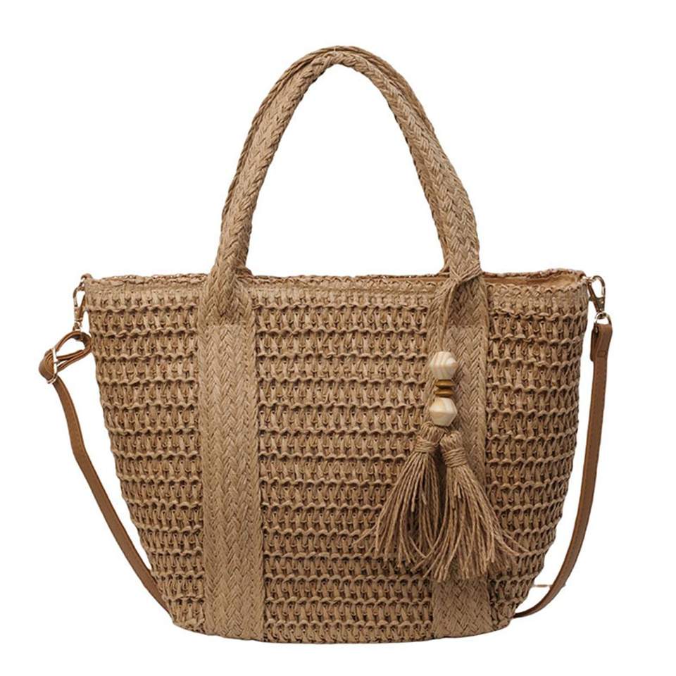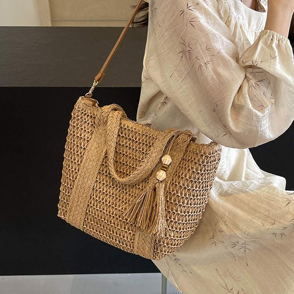 Borsa da Spiaggia in Paglia Polinesiana con Manici in Stile Cesto Francese, Chiusura Aperta, Naturale, Nero Mare, in Pelle, Portatile, Foderata in Poliestere