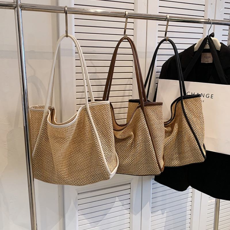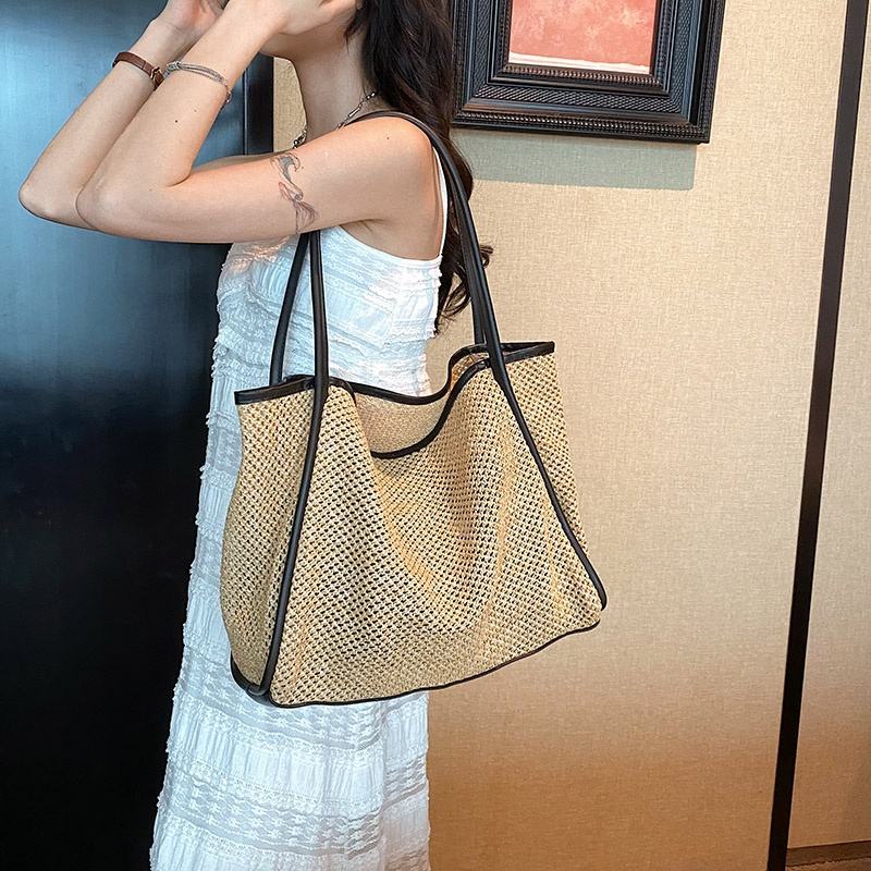 Borsa da spiaggia in vimini polinesiano con manici a cestello francese in pelle nera e nera naturale in pelle portatile foderata in poliestere