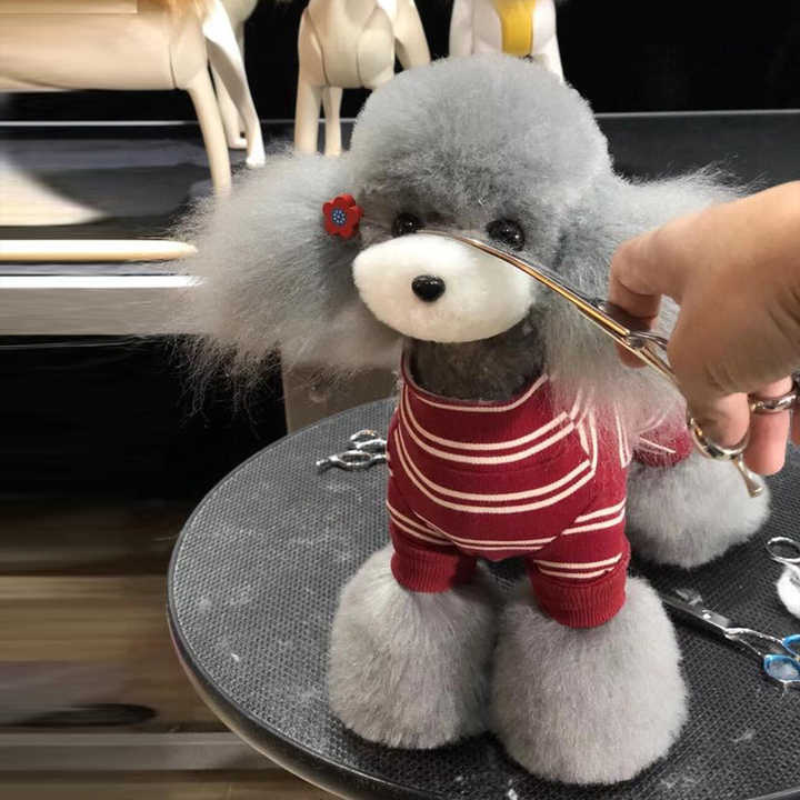 Modello di cane barboncino con pellicce grigive per la pratica di toelettatura, sponsor del groomer per il concorso creativo di cani modello
