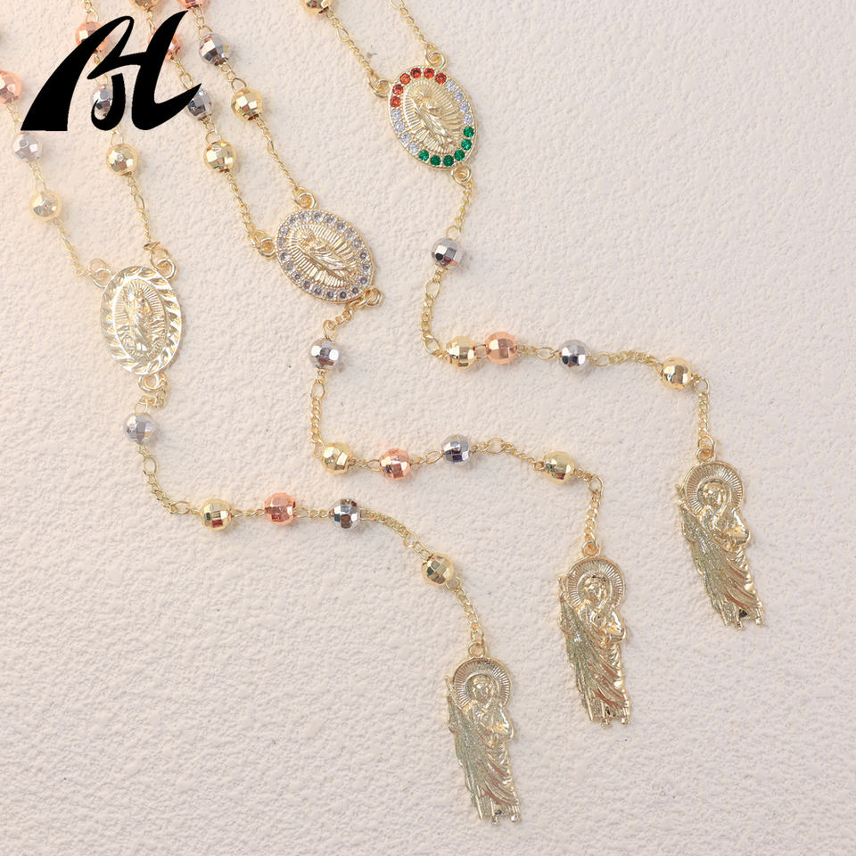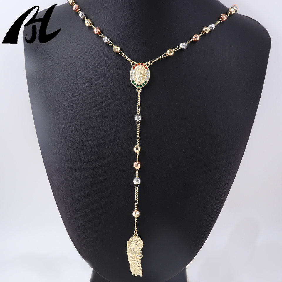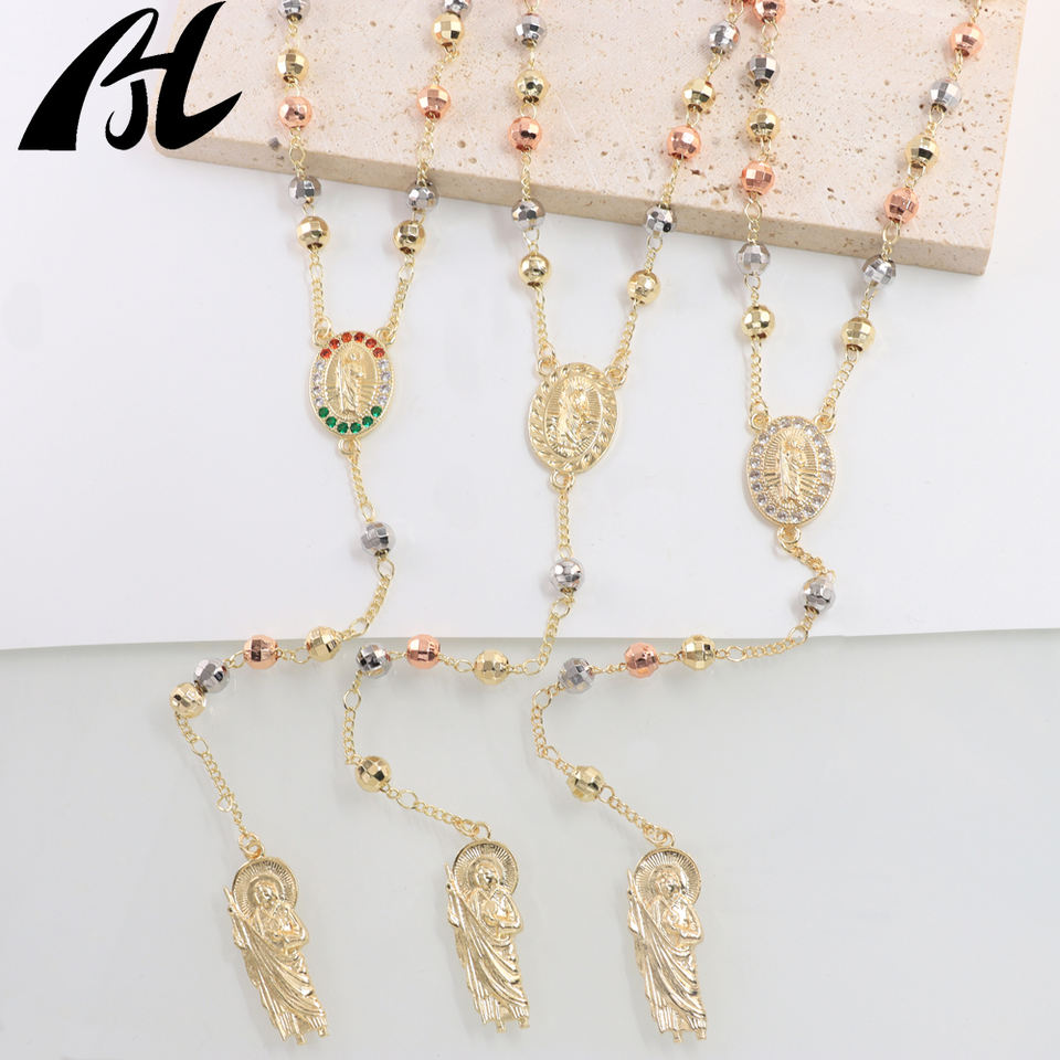 Popular 14K Gold Plated Tricolor Virgin Mary Rosary Necklace with Saint Benedict Crucifix Bead Type Chain Claw Setting Inlay