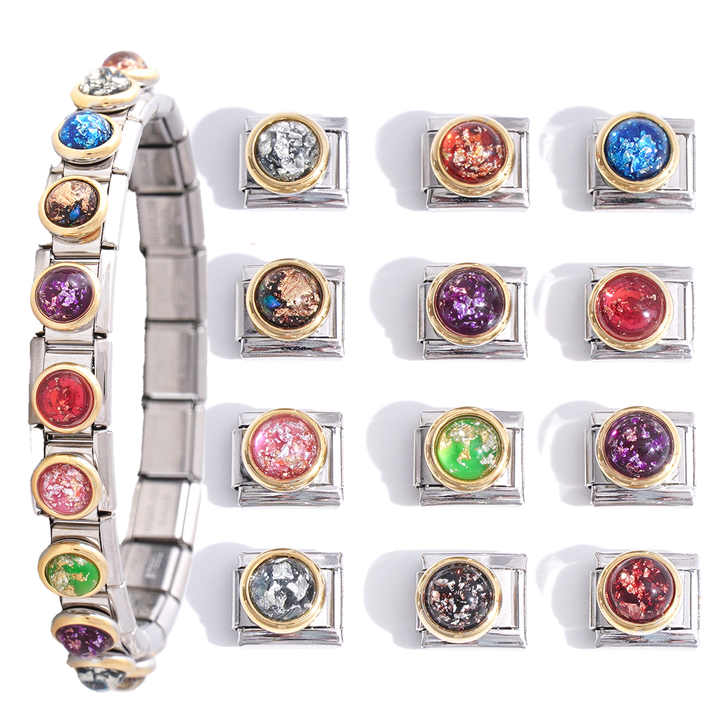 Bracciale a Maglie con Charm Italiani Popolari con Pietre Preziose, Oro Argento Acciaio Inossidabile, Pietra Portafortuna Rotonda Colorata da 9mm
