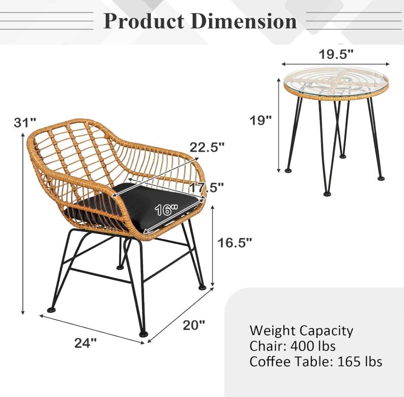 Dimensione:2 sedie singole dimensioni: 64*63*75 cm; 1 tavolo dimensioni: 46*46*47 cm