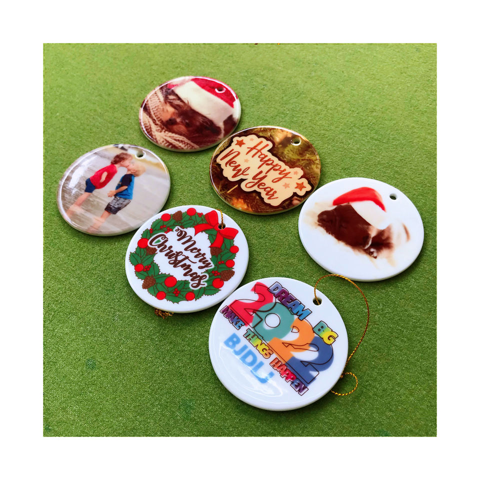 Popolare di Vendita 3 "Round 73 millimetri Gloss Bianco Porcellana Sublimazione Ornamenti Di Natale Blanks 3" di Sublimazione tazza di Ceramica Di Natale Tag