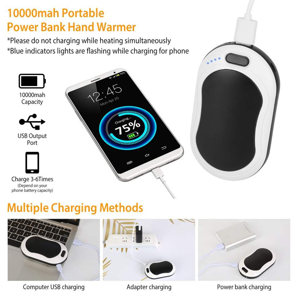 Scaldamani Portatile Ricaricabile 10000mAh con Torcia a Doppio Riscaldamento e 3 Livelli di Temperatura, Power Bank