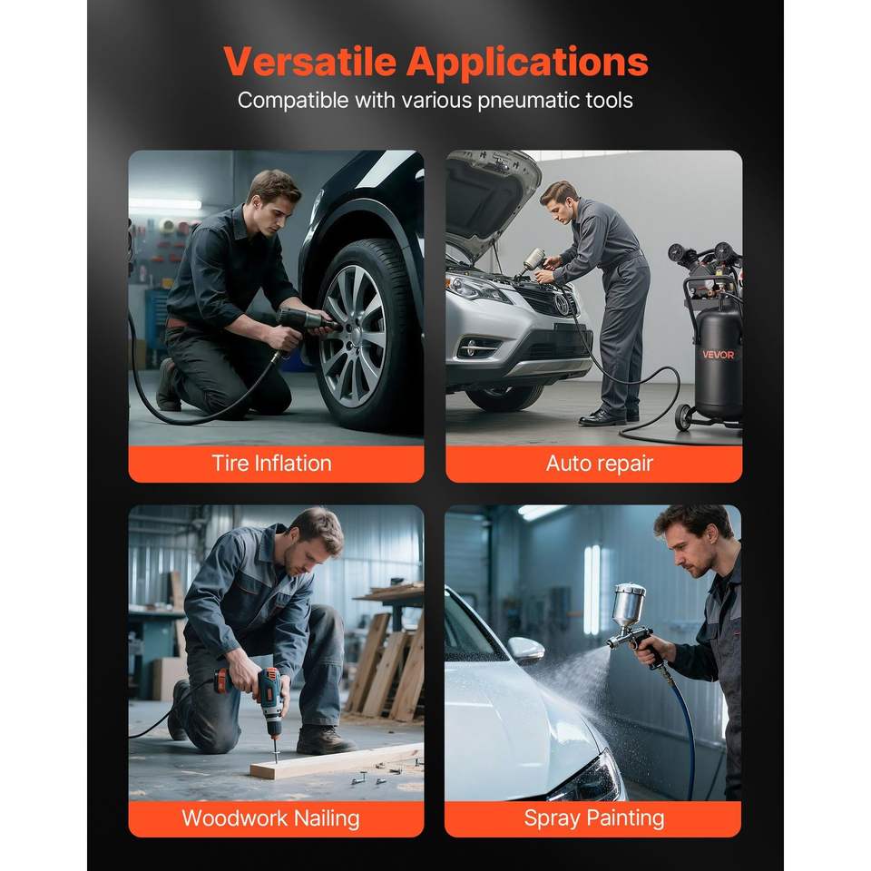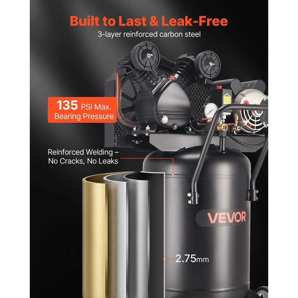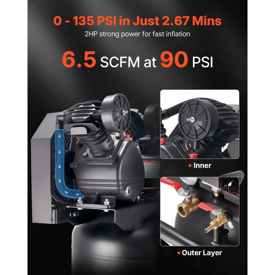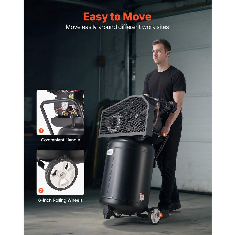 Compressore d'aria portatile da 20 galloni con motore da 2HP, 6.5SCFM, serbatoio lubrificato a olio da 90PSI, pressione massima 135PSI, compressore mobile per pneumatici a 6 ruote