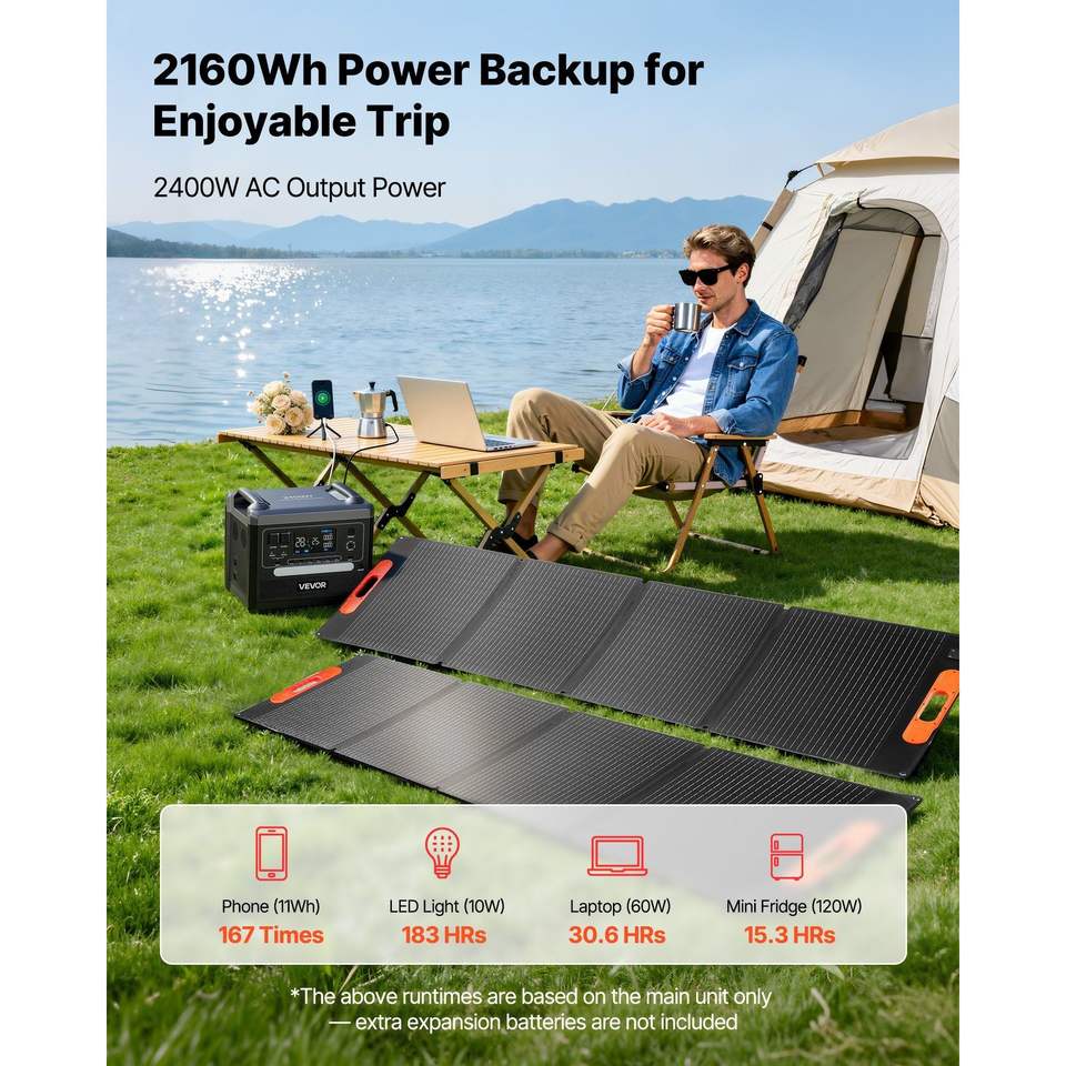 Stazione di Alimentazione Portatile 2400W con Pannelli Solari Pieghevoli da 200W e Batteria LiFePO4 Espandibile da 2160Wh, 2 Generatori Solari