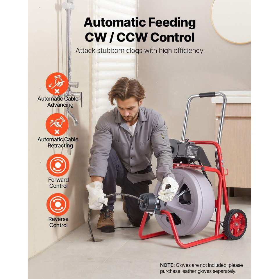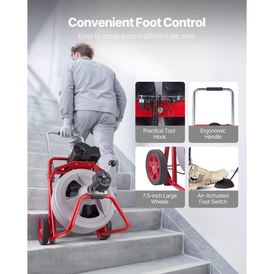 Macchina Portatile per la Pulizia degli Scarichi con Ruote a Spirale da 75 FT x 1/2 Pollici e Alimentazione Automatica, 8 Lame