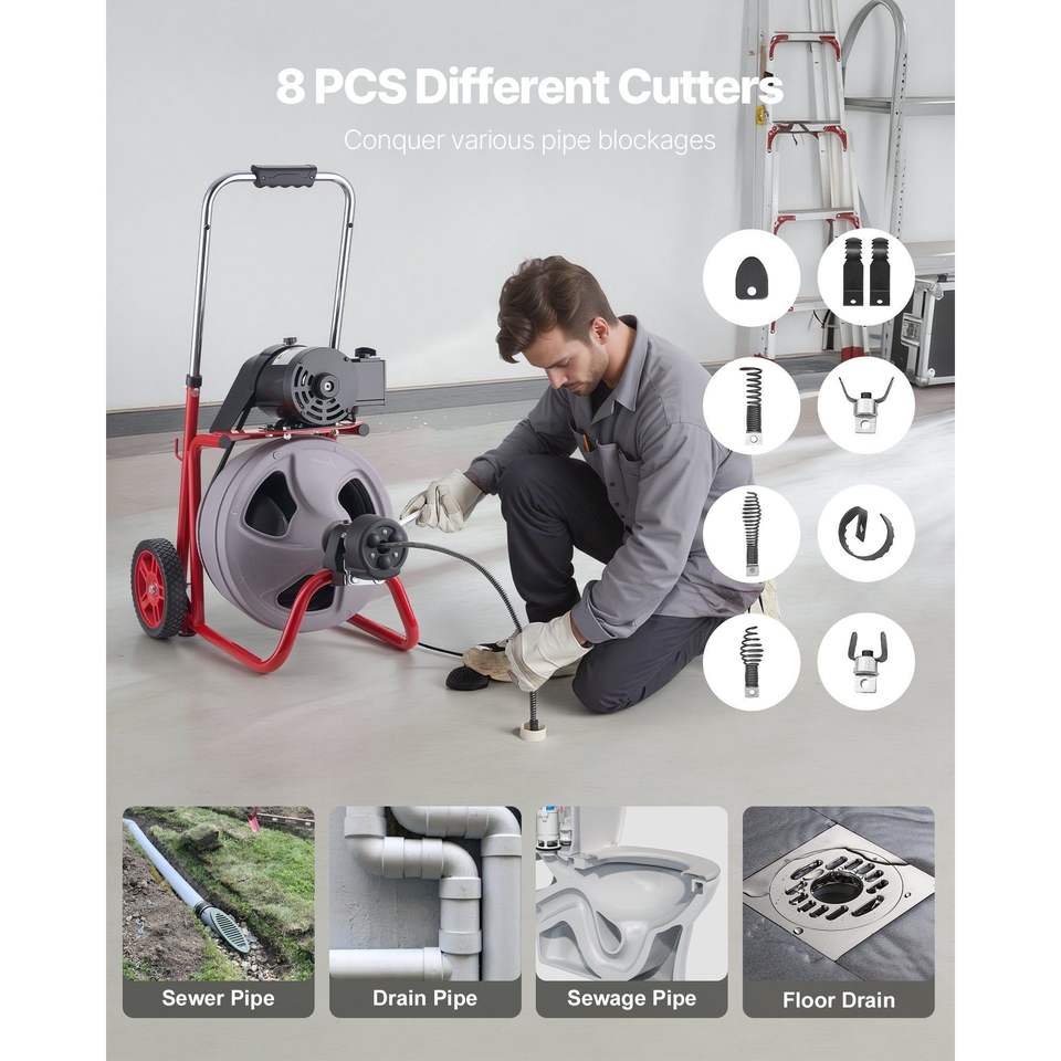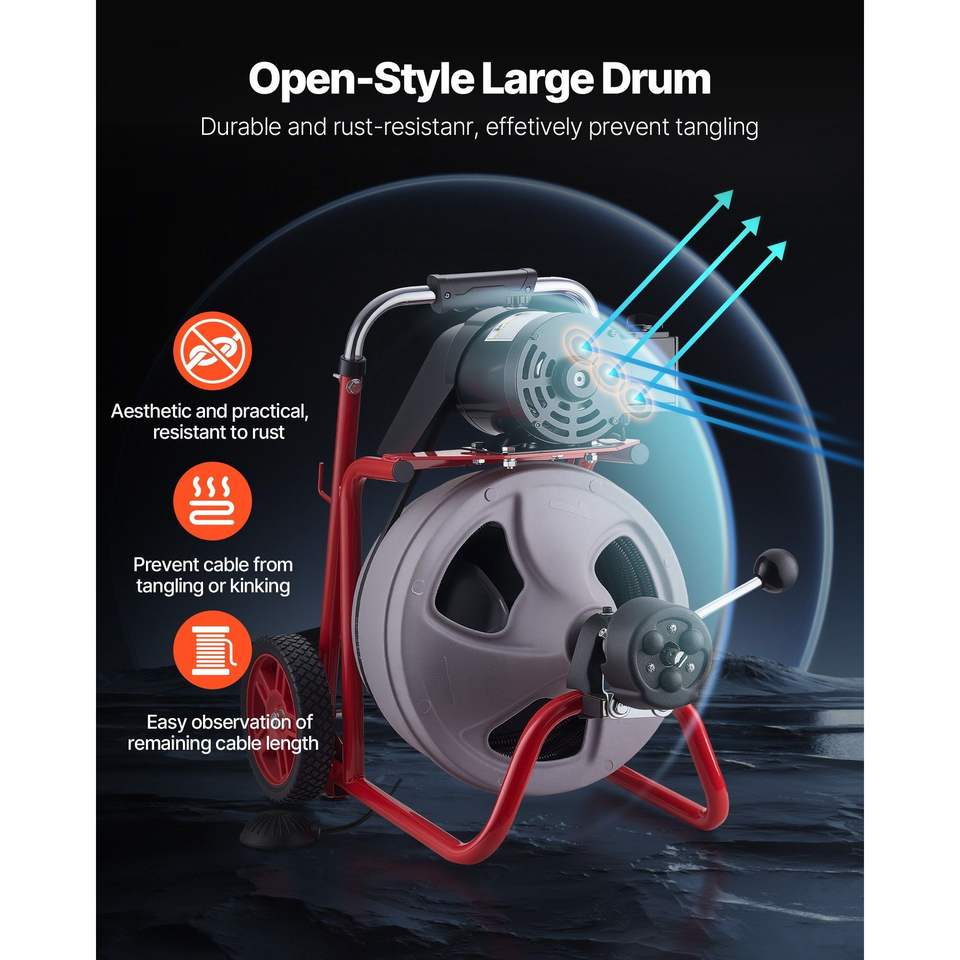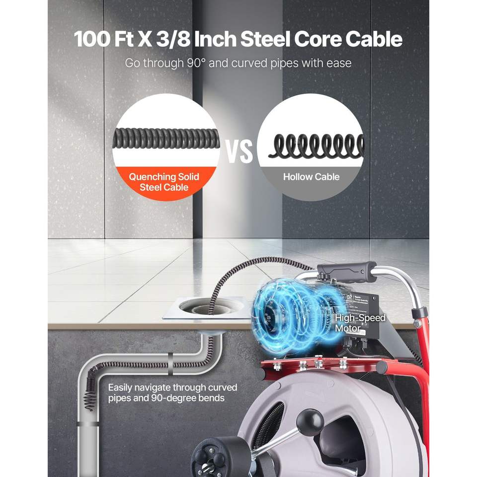 Macchina Portatile per la Pulizia degli Scarichi con Spirale Autoalimentata da 8 Piedi Cubi, Ruote e Cavo da 100 Piedi x 3/8 Pollici