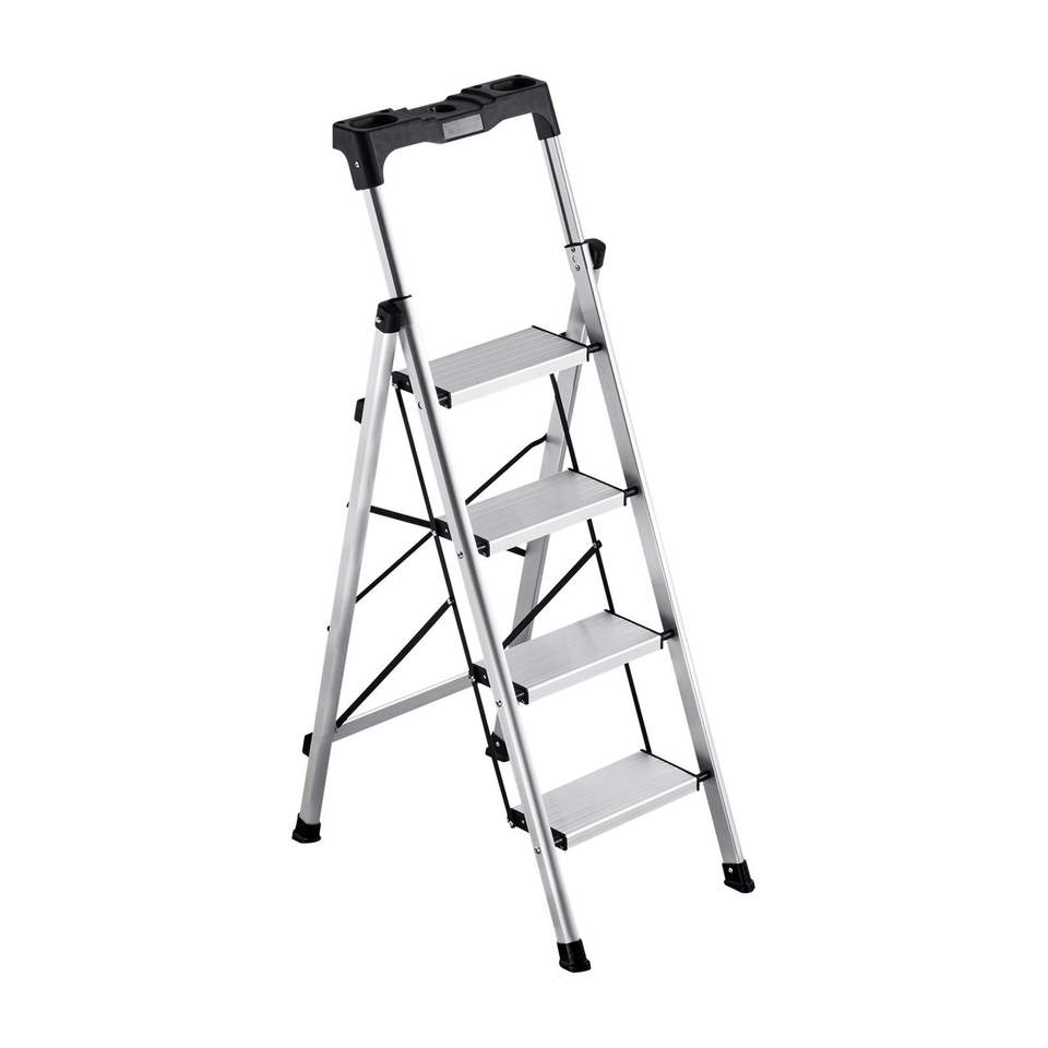 Scala Portatile in Alluminio a 4 Gradini con Pedale Antiscivolo e Impugnatura Confortevole, Design Pieghevole Largo, Capacità 330 Libbre