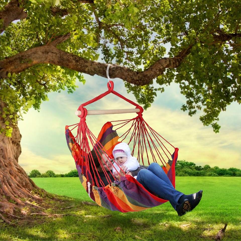 Sedia sospesa portatile in tela rossa/blu per portico, patio, campeggio, con corda per attività ricreative all'aperto