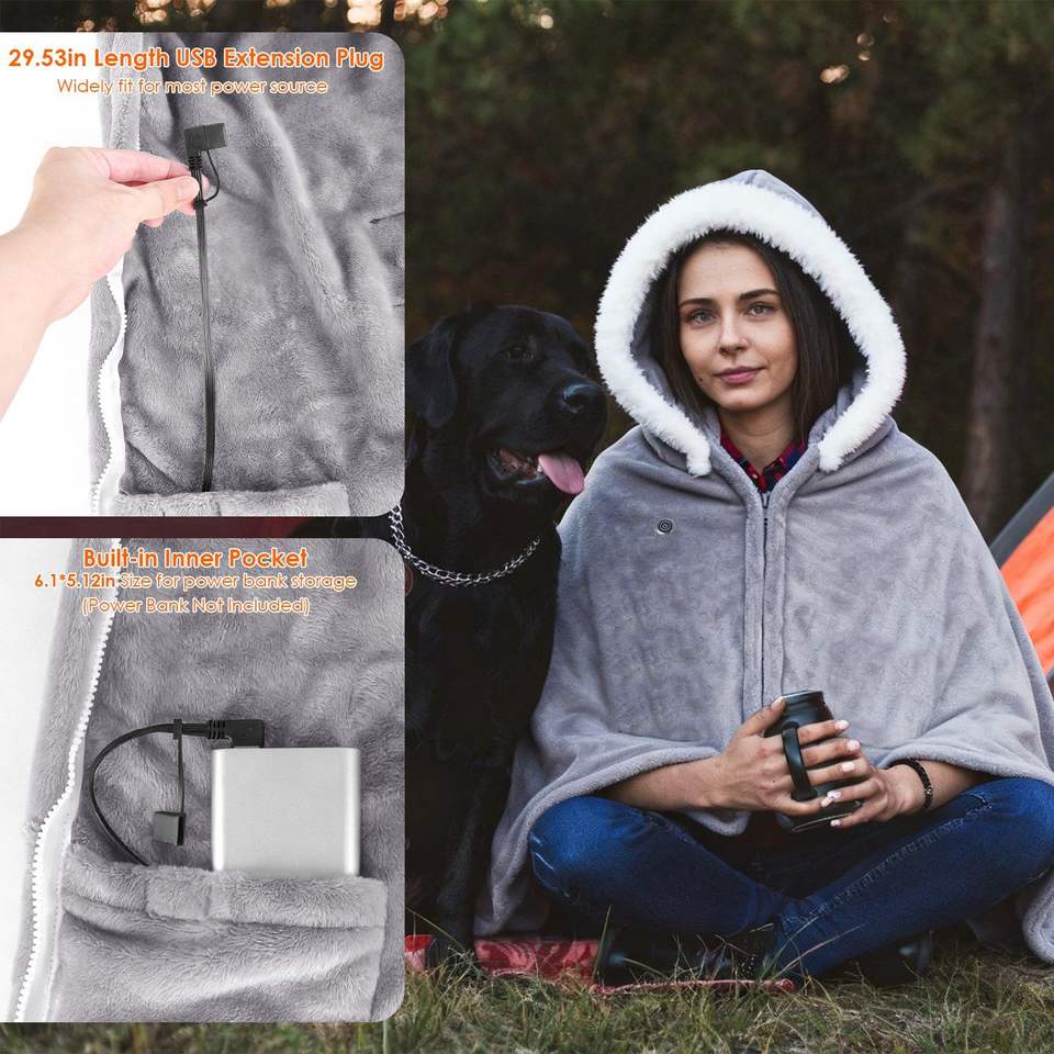 Coperta Elettrica Portatile Riscaldante a Doppio Lato in Flanella, Felpa con Cappuccio Indossabile per Uomo e Donna, Lavabile in Lavatrice, 3 Livelli di Riscaldamento
