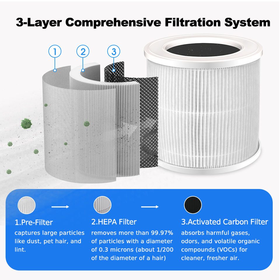 Caratteristica:Filtro a carbone attivo, Design compatto, Filtro HEPA, Ad alta Efficienza, Generatore di ioni negativi, Funzionamento silenzioso, MODALITÀ SLEEP