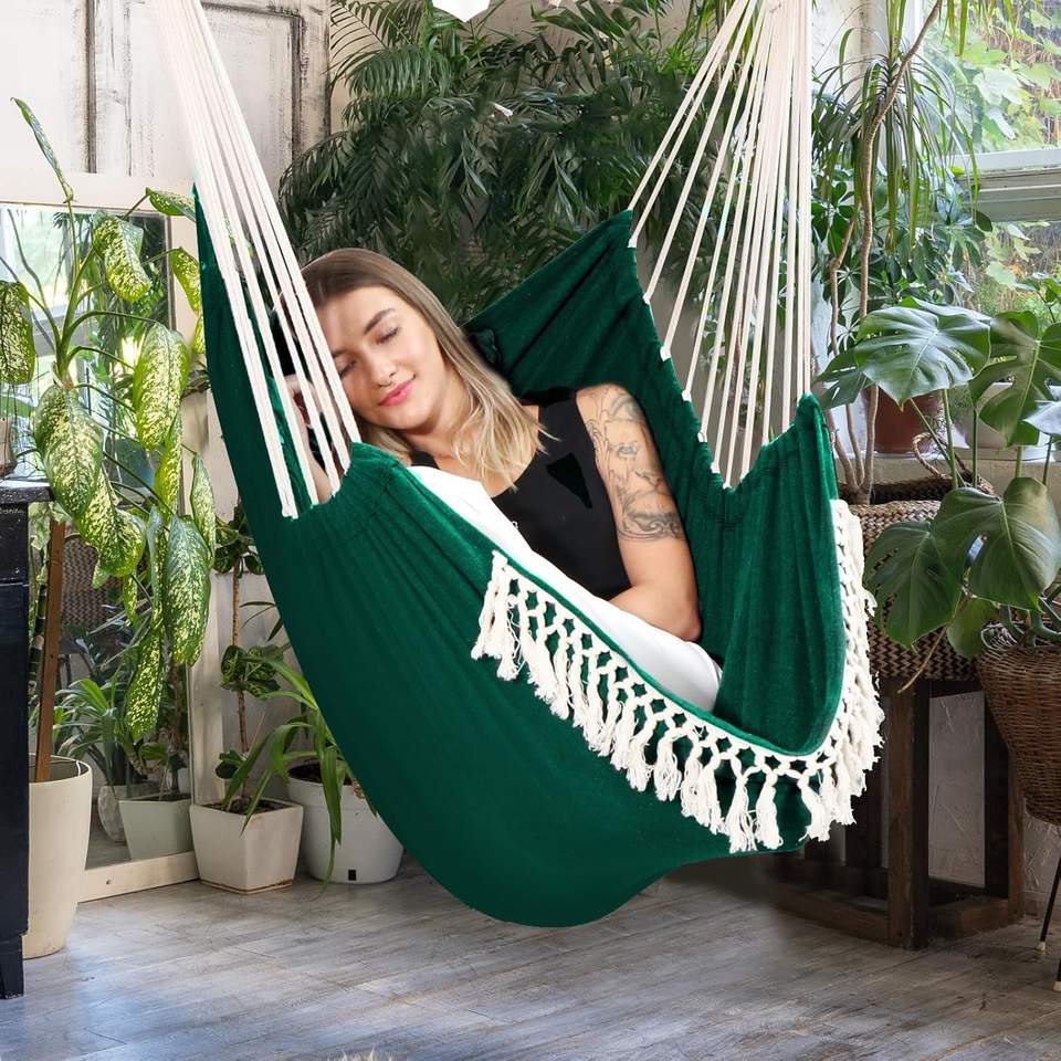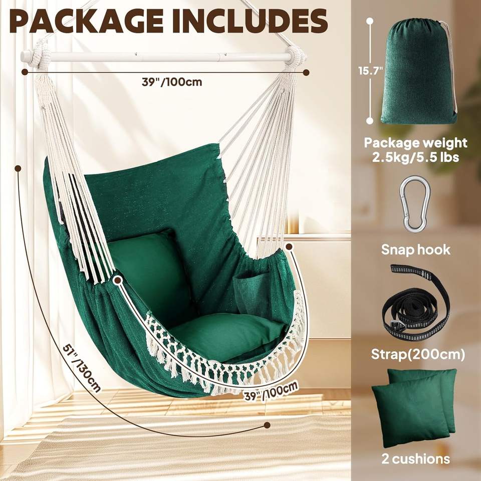 Sedia a dondolo portatile amaca sedia a dondolo tra cui 2 cuscini con barra di diffusione in acciaio e tasca laterale grande macramè