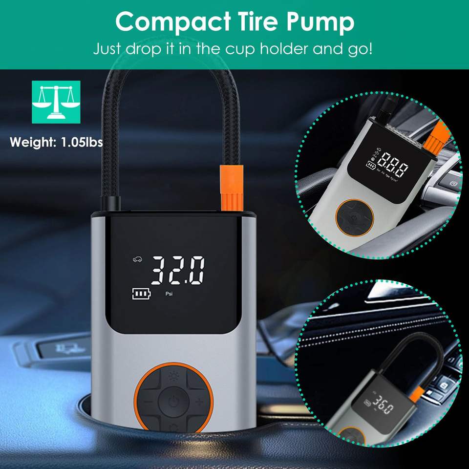 Compressore d'Aria Portatile Mini con Display Digitale LED, Gonfiatore Pneumatici 150 PSI, Ugello Gonfiabile, Power Bank di Emergenza SOS per Situazioni di Emergenza