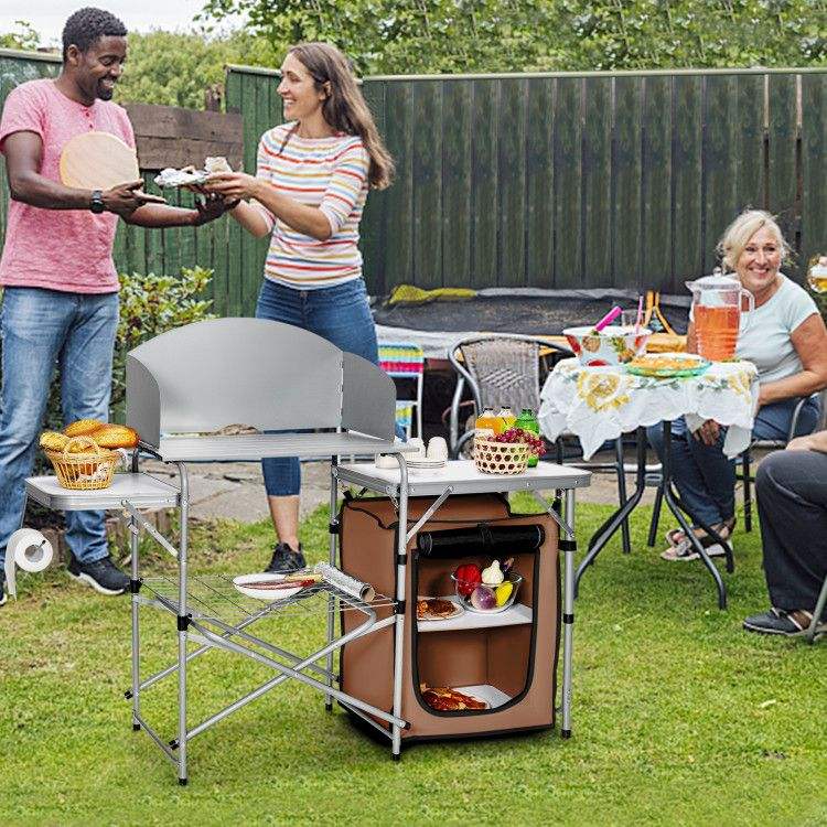 Tavolo Portatile per Barbecue all'Aperto con Paravento e Borsa per Cucinare all'Aperto