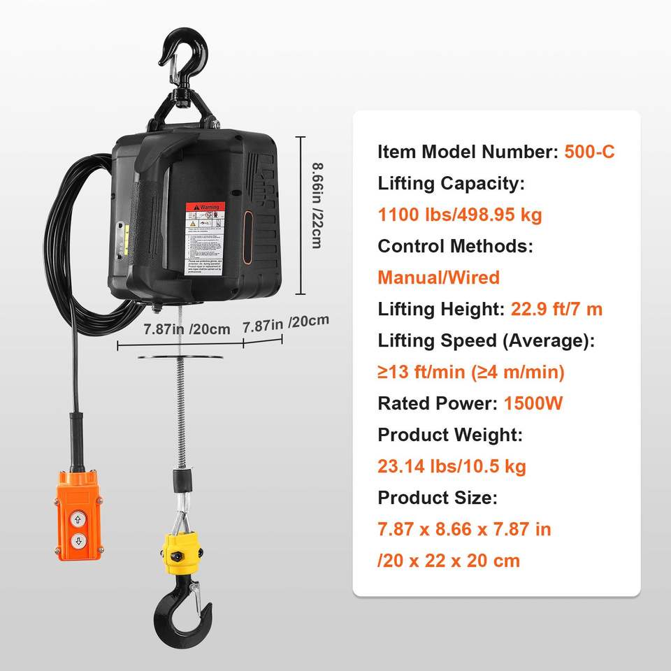 Argano Elettrico Portatile 2-in-1 da 1500W, Capacità 1100 Libbre, Altezza di Sollevamento 22.9 Piedi, Velocità 13 Piedi/Min, Telecomando Cablato
